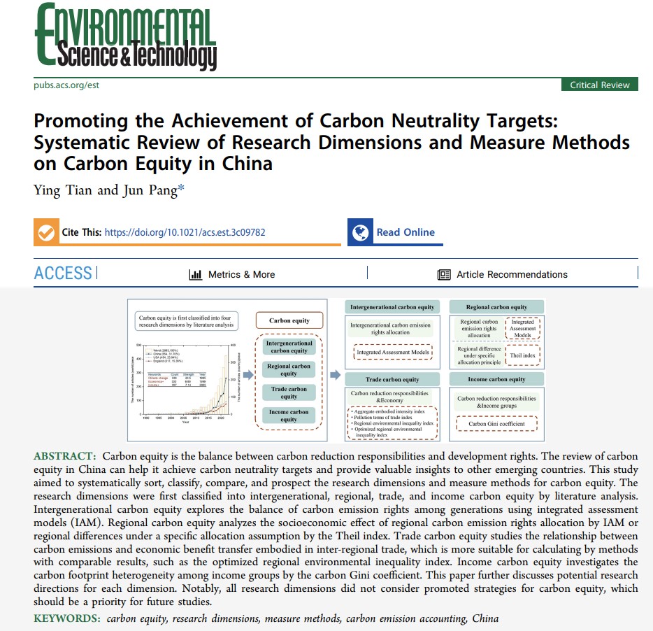 On May 30, 2024, the research team led by Professor Jun Pang at the School of Ecology & Environment, Renmin University of China, published a review paper titled “ Promoting the Achievement of Carbon Neutrality Targets: Systematic Review of Research Dimensions and Measurement Methods on Carbon Equity in China” in the top journal Environmental Science & Technology . Ying Tian, a Ph.D. candidate from the 2021 cohort in Population, Resource, and Environmental Economics, is the first author, with Professor Pang serving as the corresponding author.