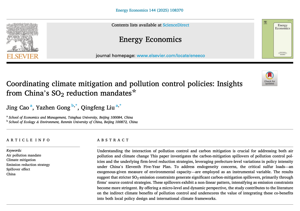 source: Cao J, Gong Y, Liu Q. Coordinating climate mitigation and pollution control policies: Insights from China's SO2 reduction mandates[J]. Energy Economics, 2025: 108370. //doi.org/10.1016/j.eneco.2025.108370