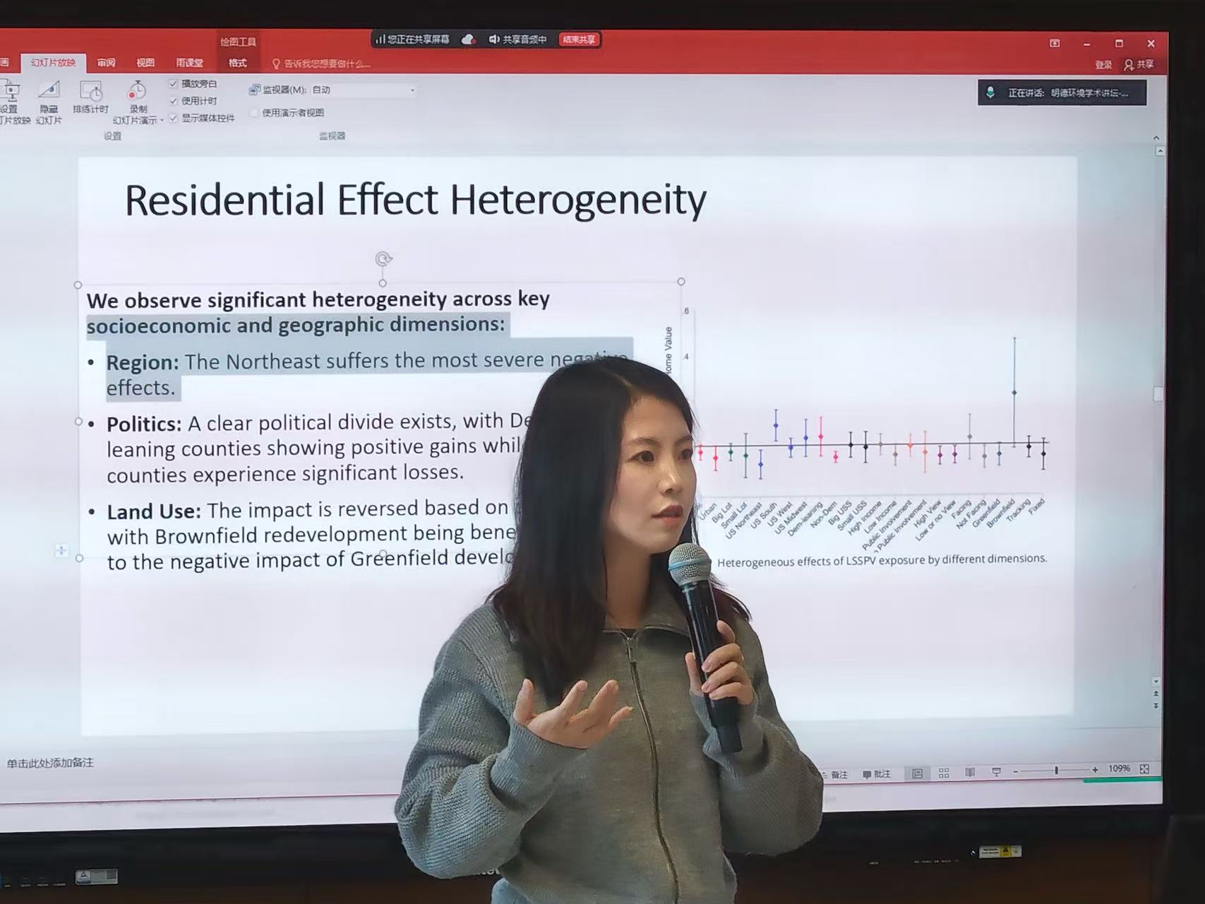 刘鹏飞教授进一步介绍了研究团队基于美国加州房产交易与充电基础设施布局数据开展的电动车充电设施研究。结果表明,合理布局充电站不仅可以提升周边房产价值,还通过推动电动车普及、改善局地空气质量,在经济与环境维度产生协同收益。在其他新能源基础设施外部性的研究进展中,刘鹏飞教授以“新能源设施外部性的经济估值”为主线,强调在统一框架下对不同类型新能源设施的正负外部性进行可比分析,为政府在选址、补偿与监管上的政策设计提供量化依据。