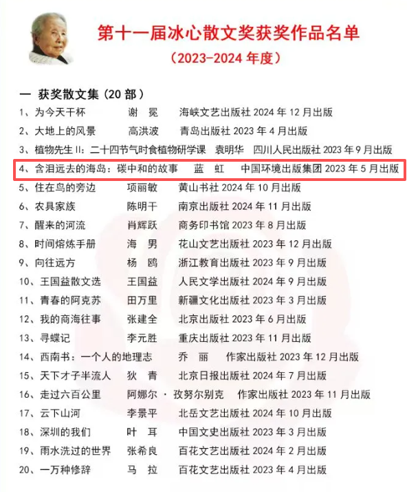 我院蓝虹教授作品《含泪远去的海岛:碳中和的故事》荣获第十一届冰心散文奖
